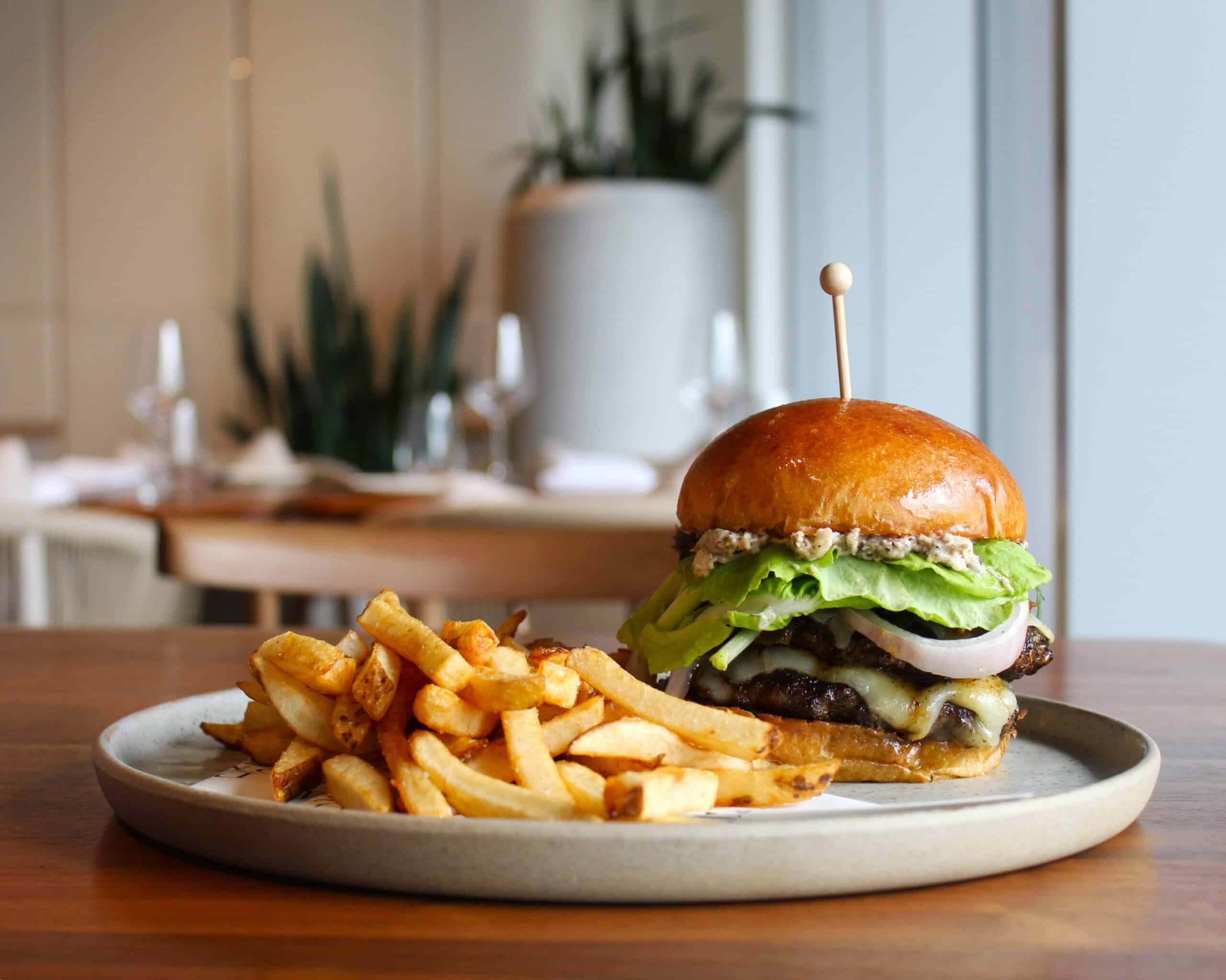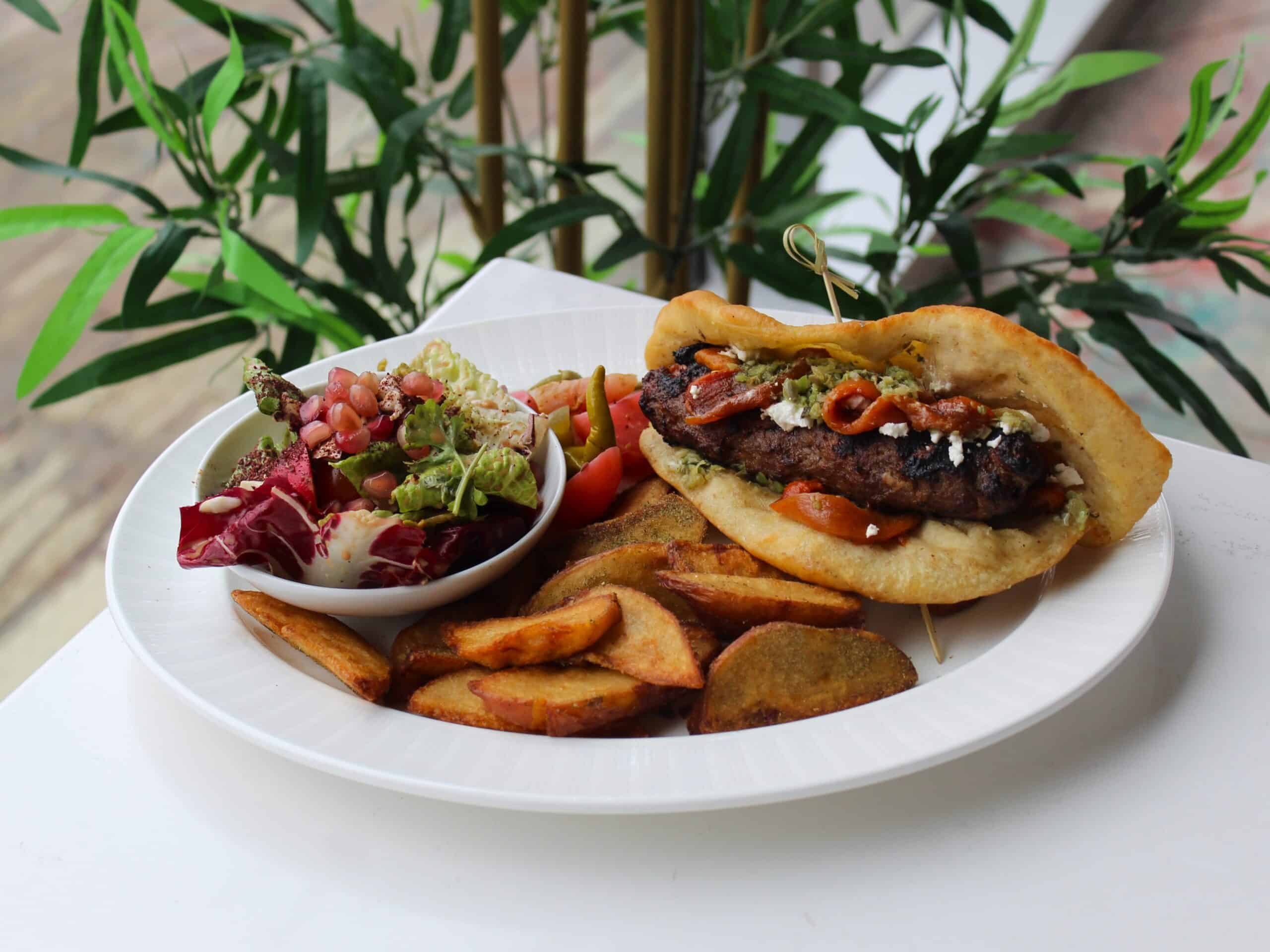 Savour every bite of Daryâ’s Mediterranean Lamb Koobideh Burger. Served with lemon fries and housemade pickles, it’s perfect for both dinner and weekend brunch!